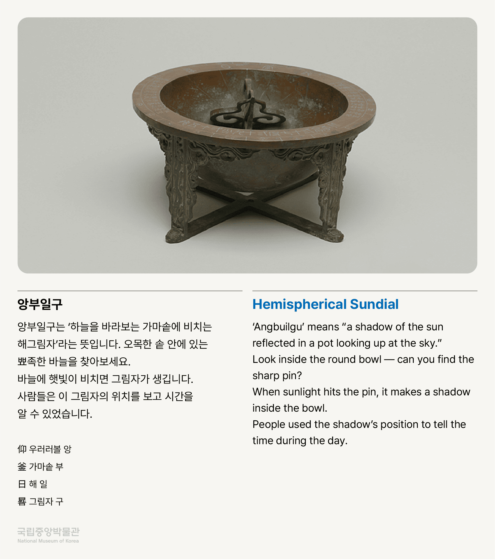 국립중앙박물관이(가) 창작한 어린이박물관 '시간 여행 안내소' 감상자료_앙부일구 저작물은 공공누리 "공공저작물 자유이용허락 출처표시+상업적 이용금지+변경금지" 조건에 따라 이용할 수 있습니다. |
