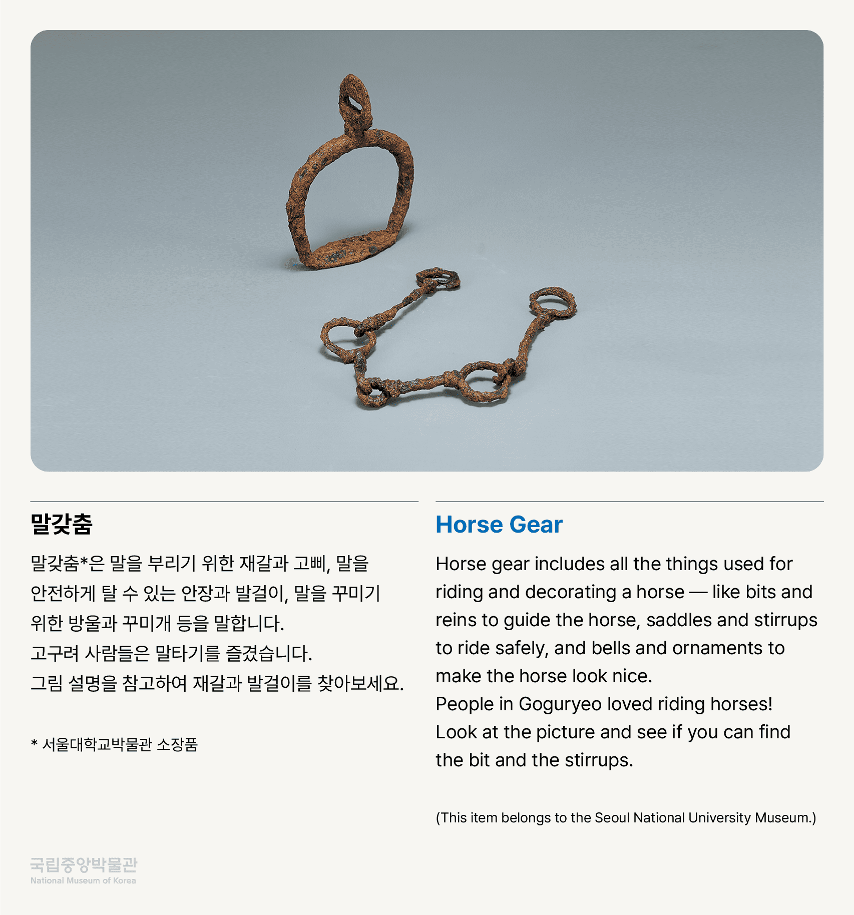 어린이박물관 대기 공간 ‘시간 여행 안내소’ 콘텐츠와 연계하는 상설전시실 전시품 감상 자료입니다. 위쪽의 [파일보기]를 누르시면 더 크게 볼 수 있습니다. 말갖춤 말갖춤*은 말을 부리기 위한 재갈과 고삐, 말을 안전하게 탈 수 있는 안장과 발걸이, 말을 꾸미기 위한 방울과 꾸미개 등을 말합니다. 고구려 사람들은 말타기를 즐겼습니다. 그림 설명을 참고하여 재갈과 발걸이를 찾아보세요. * 서울대학교박물관 소장품 국립중앙박물관 |
