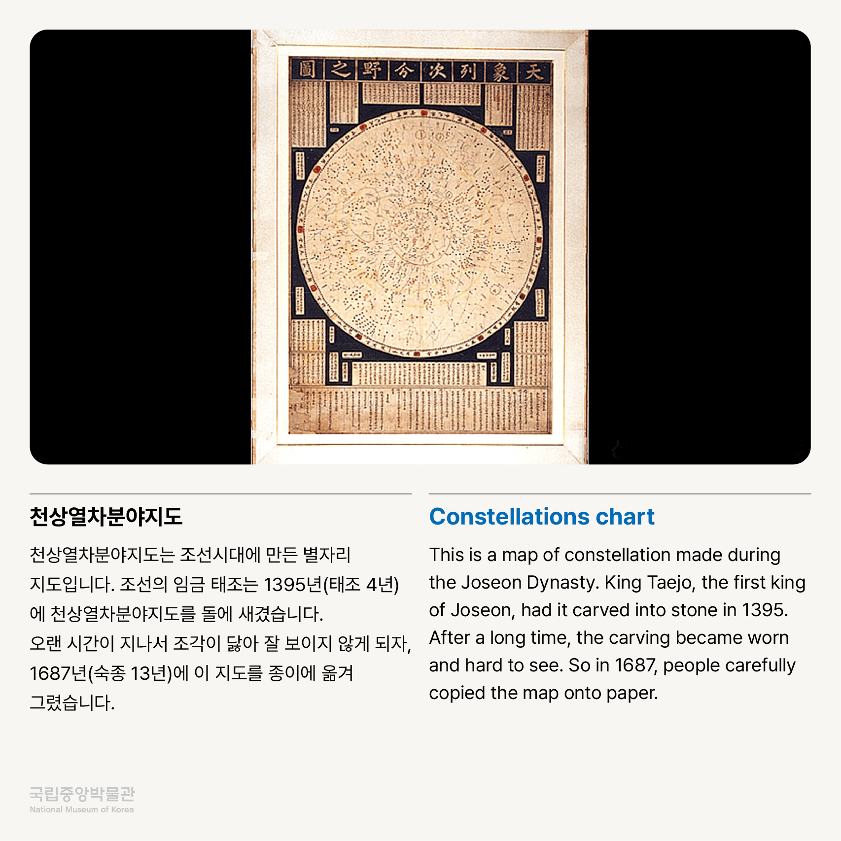 어린이박물관 대기 공간 ‘시간 여행 안내소’ 콘텐츠와 연계하는 상설전시실 전시품 감상 자료입니다. 위쪽의 [파일보기]를 누르시면 더 크게 볼 수 있습니다. 천상열차분야지도 천상열차분야지도는 조선시대에 만든 별자리 지도입니다. 조선의 임금 태조는 1395년(태조 4년)에 천상열차분야지도를 돌에 새겼습니다. 오랜 시간이 지나서 조각이 닳아 잘 보이지 않게 되자, 1687년(숙종 13년)에 이 지도를 종이에 옮겨 그렸습니다. 국립중앙박물관 |