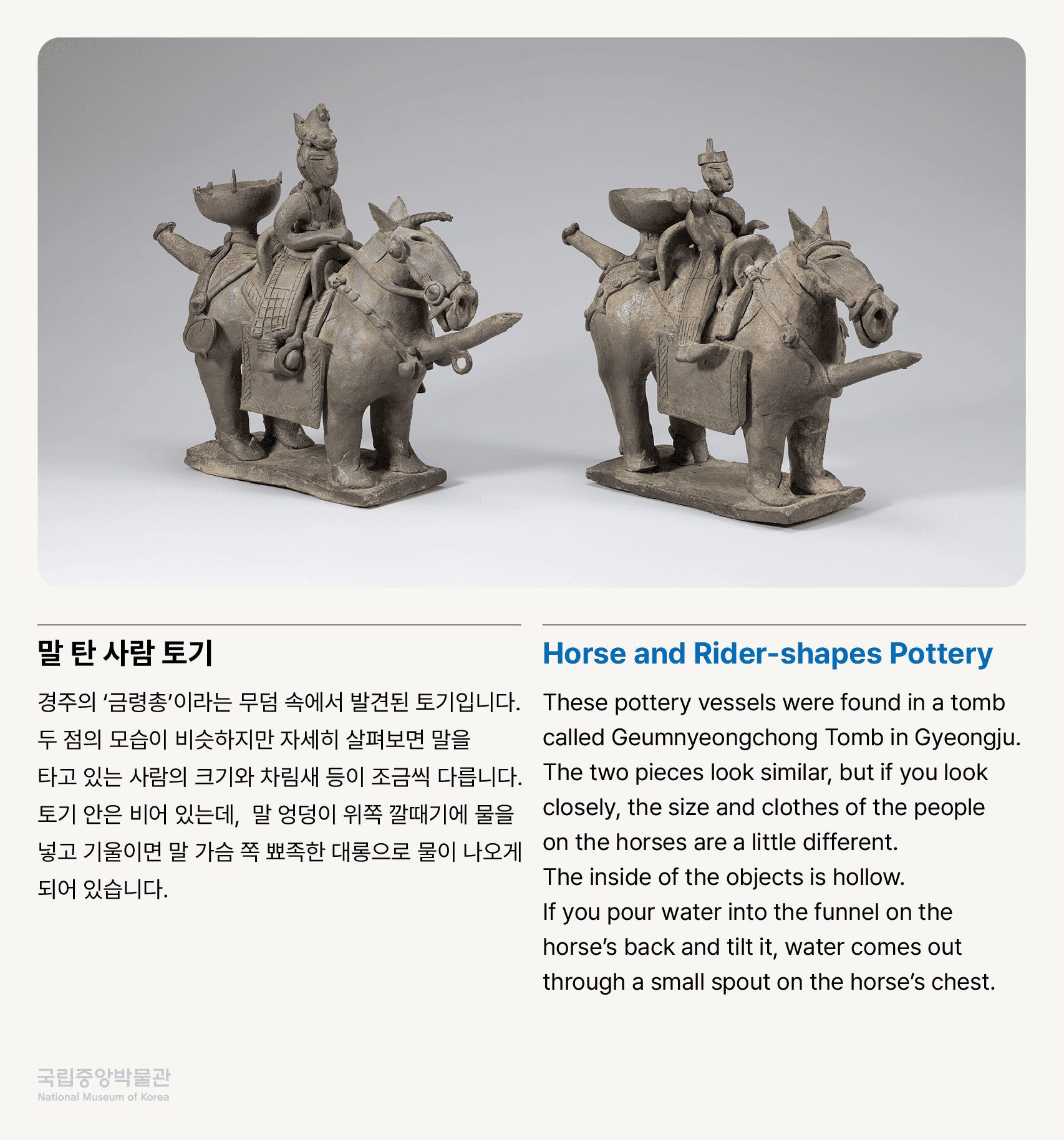 어린이박물관 대기 공간 ‘시간 여행 안내소’ 콘텐츠와 연계하는 상설전시실 전시품 감상 자료입니다. 위쪽의 [파일보기]를 누르시면 더 크게 볼 수 있습니다. 말 탄 사람 토기 경주의 ‘금령총’이라는 무덤 속에서 발견된 토기입니다. 두 점의 모습이 비슷하지만 자세히 살펴보면 말을 타고 있는 사람의 크기와 차림새 등이 조금씩 다릅니다. 토기 안은 비어 있는데, 말 엉덩이 위쪽 깔때기에 물을 넣고 기울이면 말 가슴 쪽 뾰족한 대롱으로 물이 나오게 되어 있습니다. 국립중앙박물관 |