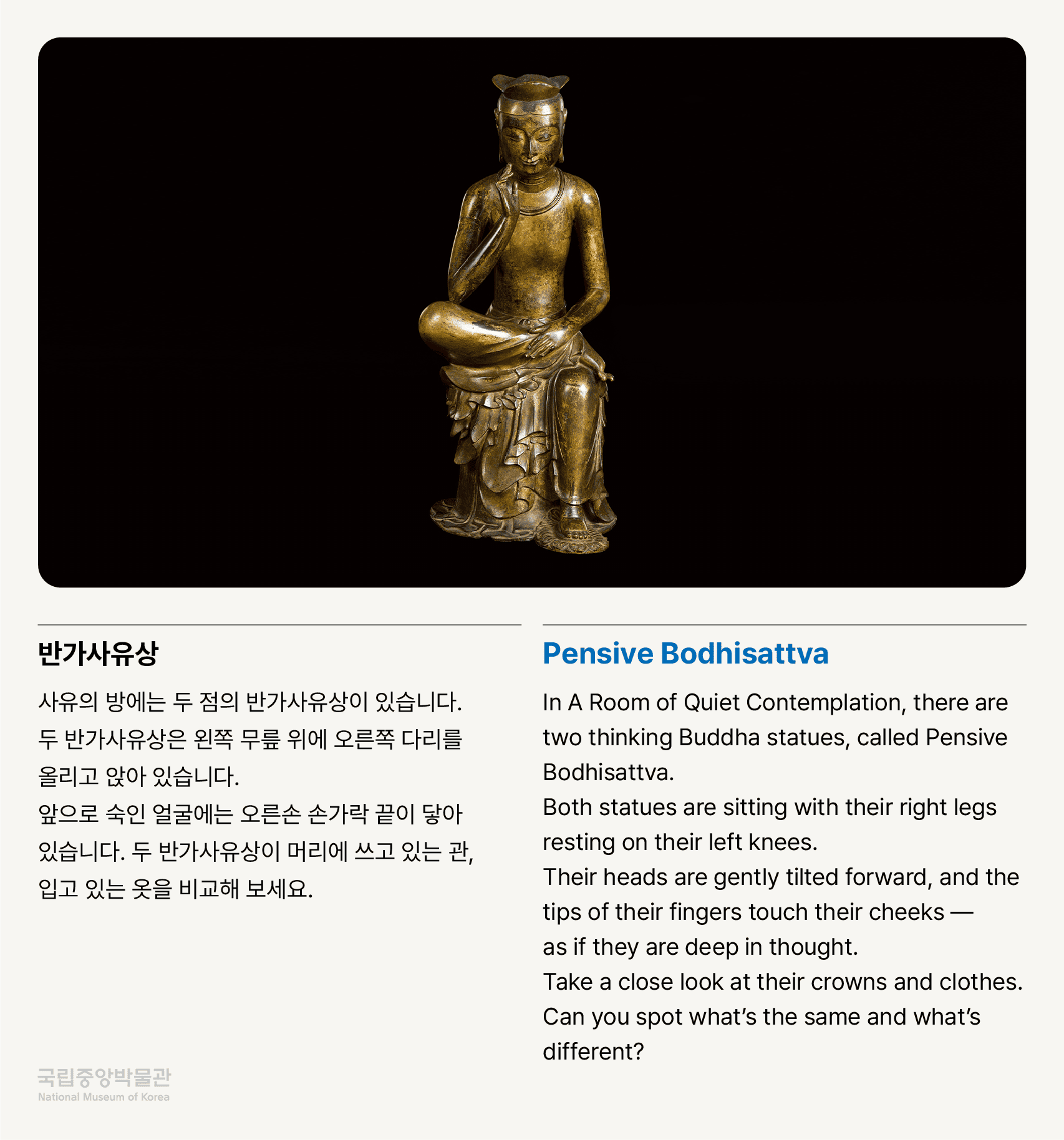 어린이박물관 대기 공간 ‘시간 여행 안내소’ 콘텐츠와 연계하는 상설전시실 전시품 감상 자료입니다. 위쪽의 [파일보기]를 누르시면 더 크게 볼 수 있습니다. 반가사유상 사유의 방에는 두 점의 반가사유상이 있습니다. 두 반가사유상은 왼쪽 무릎 위에 오른쪽 다리를 올리고 앉아 있습니다. 앞으로 숙인 얼굴에는 오른손 손가락 끝이 닿아 있습니다. 두 반가사유상이 머리에 쓰고 있는 관, 입고 있는 옷을 비교해 보세요. 국립중앙박물관 |