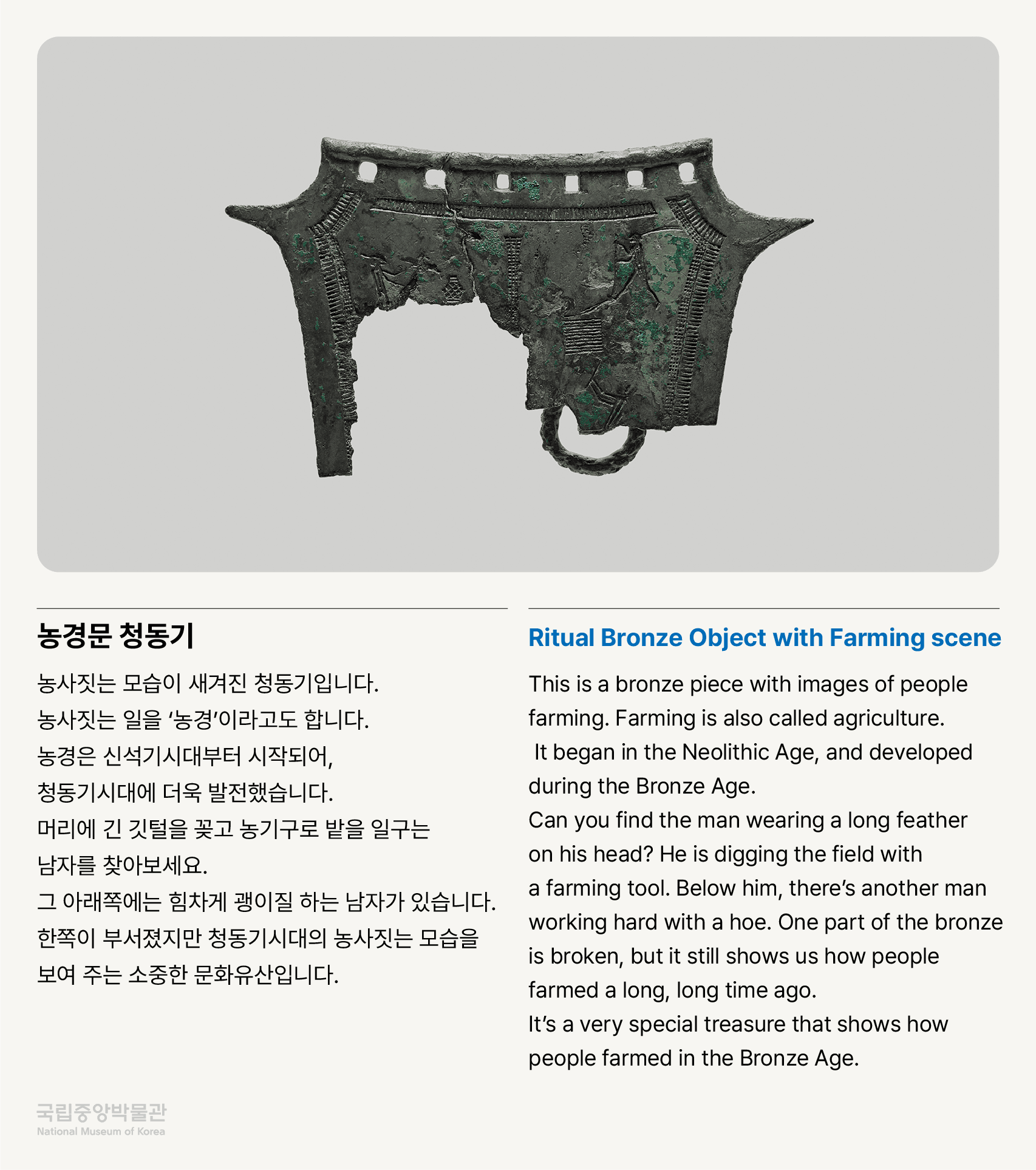 어린이박물관 대기 공간 ‘시간 여행 안내소’ 콘텐츠와 연계하는 상설전시실 전시품 감상 자료입니다. 위쪽의 [파일보기]를 누르시면 더 크게 볼 수 있습니다. 농경문 청동기 농사짓는 모습이 새겨진 청동기입니다. 농사짓는 일을 ‘농경’이라고도 합니다. 농경은 신석기시대부터 시작되어, 청동기시대에 더욱 발전했습니다. 머리에 긴 깃털을 꽂고 농기구로 밭을 일구는 남자를 찾아보세요. 그 아래쪽에는 힘차게 괭이질 하는 남자가 있습니다. 한쪽이 부서졌지만 청동기시대의 농사짓는 모습을 보여 주는 소중한 문화유산입니다. 국립중앙박물관 |