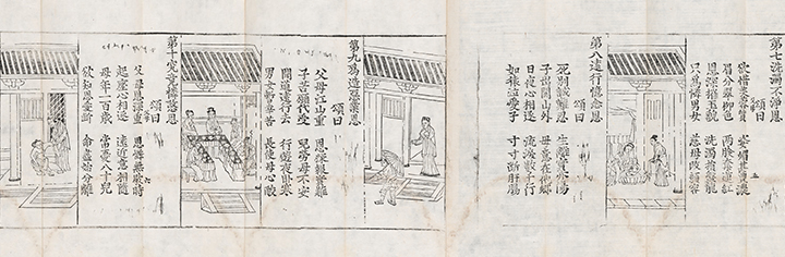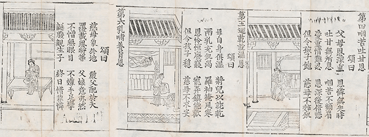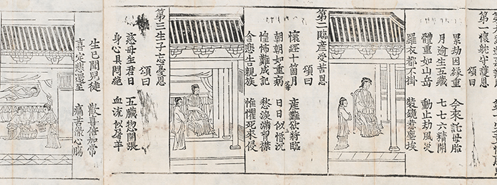The sutra lists ten “benevolences” of mothers that are deserving of reverence. The first is the benevolence of a mother who takes care of her own body during pregnancy in order to protect her unborn child. In the accompanying illustration, a pregnant mother sits in an indoor space, along with a maid. The second benevolence praises mothers for enduring the increasing pain of childbirth. The second illustration is similar to the first, except that the curtains in the room are drawn, implying that the lady of the house is near childbirth. The third benevolence is that of a mother who forgets all of her own pains and concerns after giving birth to her child. In the image, the exhausted mother lies in bed after childbirth, while two maids give the baby a bath. The remaining seven benevolences are presented in the same way, with text accompanied by an interpretive illustration.