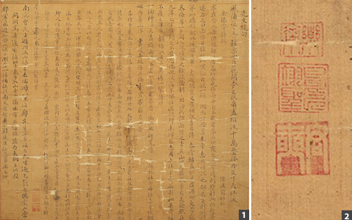 2 Three seals of Shin Ikseong (from top to bottom): his penname, “Nakjeon” (樂全); his given name, “Shin Ikseong Seal” (申翊聖印); and his courtesy name, “Gunseok” (君奭). After the seals, there is additional text (the last three vertical lines on the left), which seem to have been written at a faster pace in slightly thicker ink than the previous text. These lines are excerpts from Jo Sik’s Traveling Around Duryusan Mountain (遊頭流錄) and Jeong Gu’s Traveling Around Gayasan Mountain (遊伽倻山錄), both of which contain records about Jeong Yeochang’s place of residence.