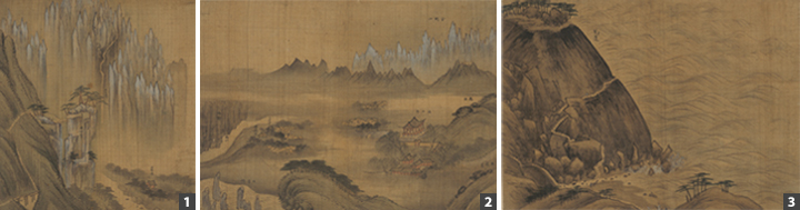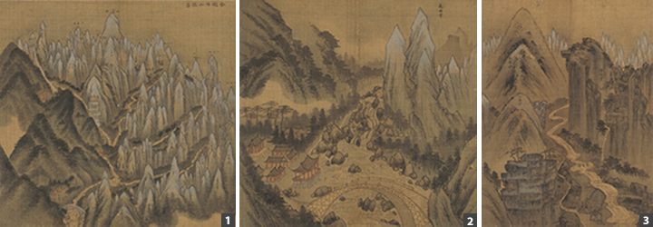 The three paintings complement one another, with the latter two works providing more detailed views of sections of Comprehensive View of Inner Geumgang, thus enhancing the viewer’s understanding of the local geography. In the third painting, the sharp peaks of Junghyangseong can be seen in the background behind Bodeokgul Hermitage.